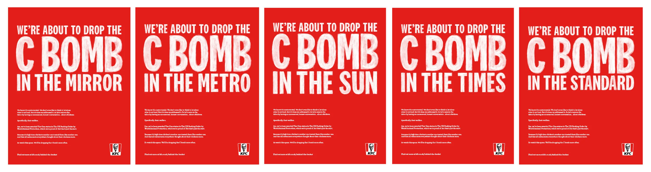 To bring attention to KFC’s fledgling commitment to animal welfare, we dropped the C Bomb. A nod to a very controversial word and one that KFC wants to be talking about a lot more; chickens.